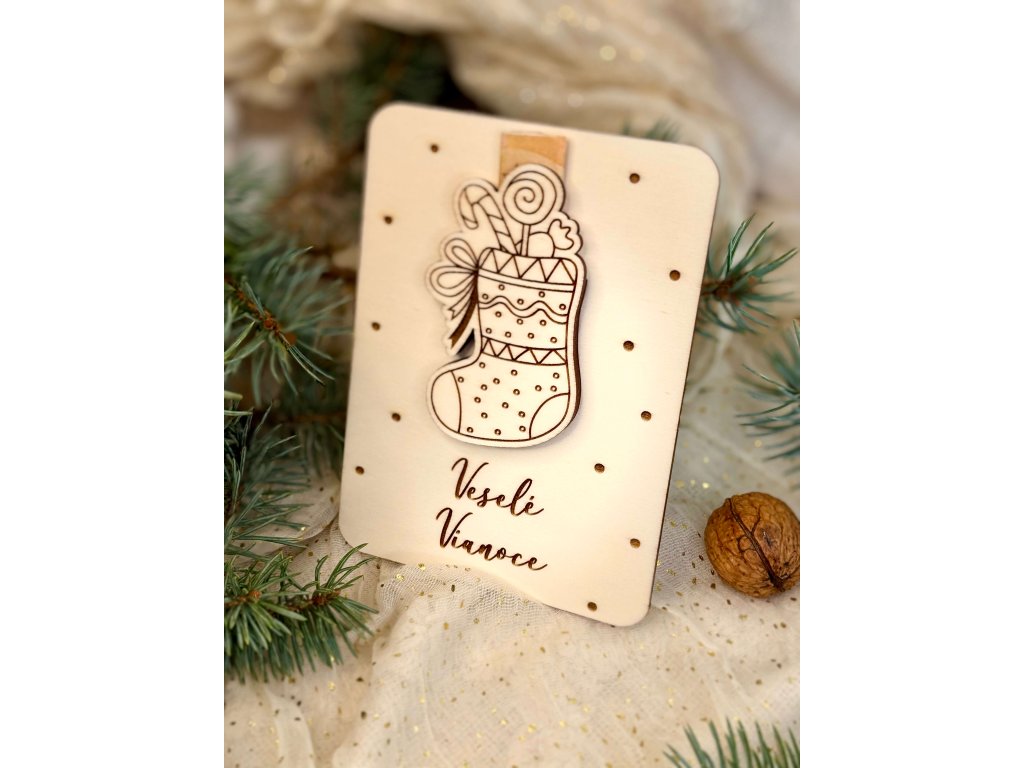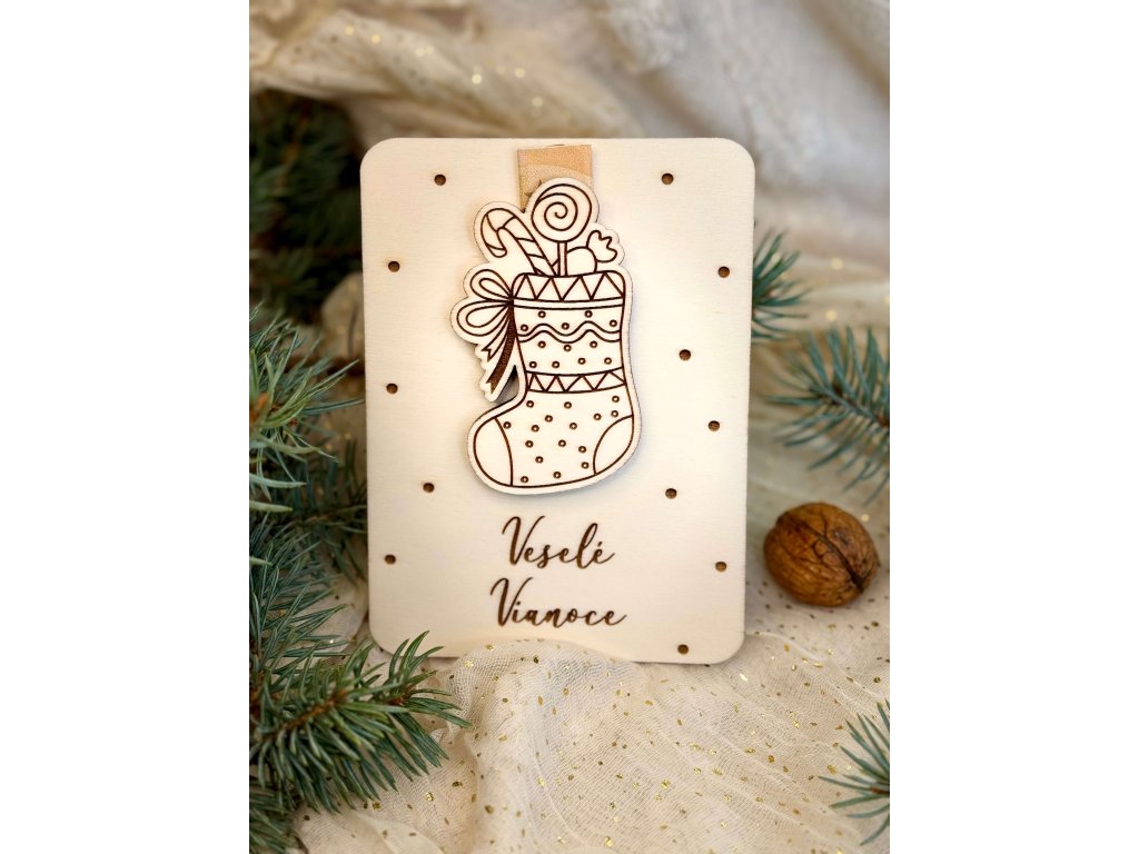 Drevená karta na peniaze – Veselé Vianoce, vianočné pančucha
