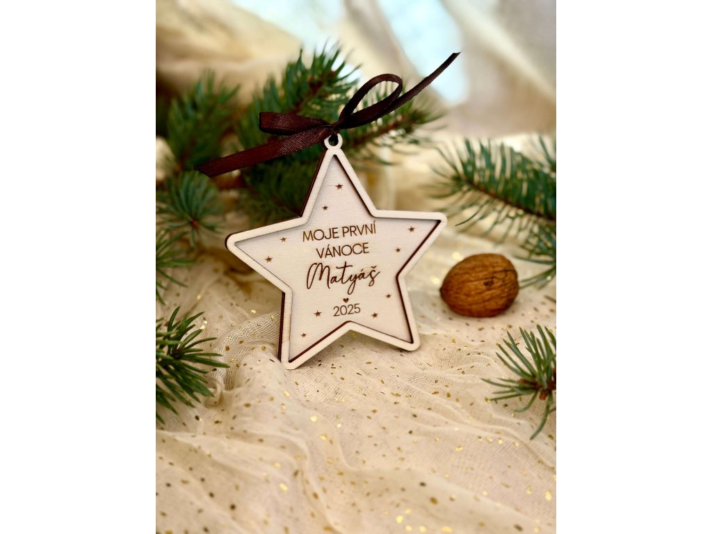 Vyrobená v tvare hviezdy, ozdoba s jemným gravírovaním Moje prvé Vianoce a možnosťou personalizácie mena podľa vášho priania.
