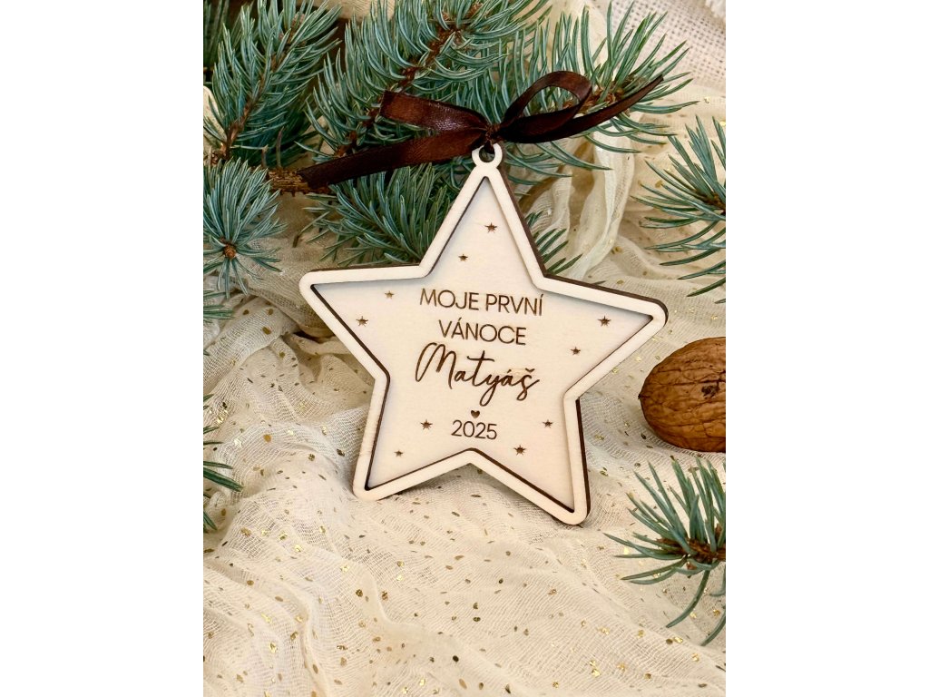 Drevená vianočná ozdoba hviezda - dvojvrstvová, Moje prvé Vianoce