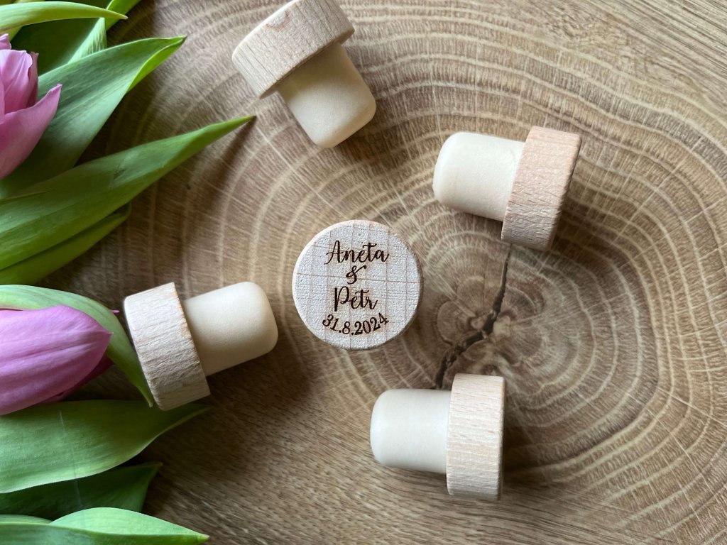 Drevená zátka na fľašu svadobného vína.